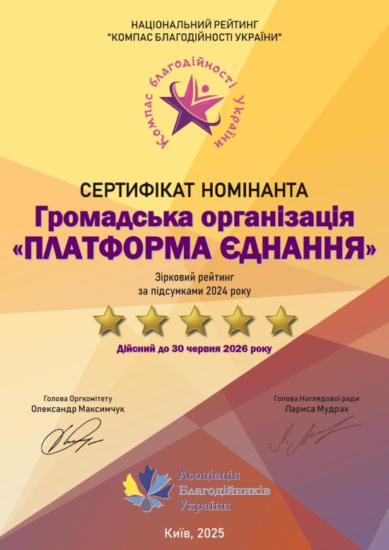 ГО «Платформа Єднання» (NGO Unity Platform) за результатами оцінювання діяльності фонду набрав 106 балів у Національному рейтингу «Компас благодійності України», які конвертувалися у найвищу оцінку рейтингу – 5 зірок. Вітаємо колег та дякуємо за довіру.